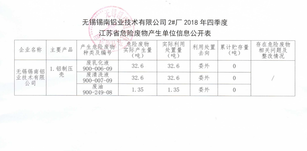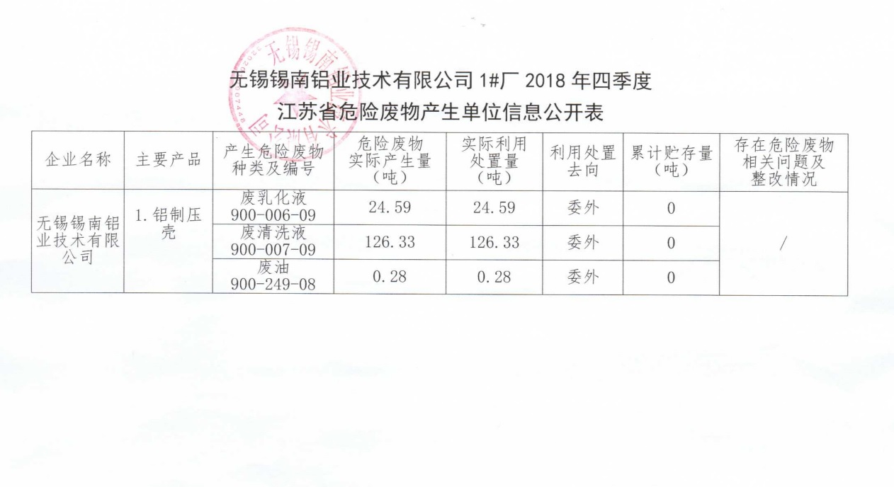江蘇省危險(xiǎn)廢物產(chǎn)生單位信息公開表(四季度)